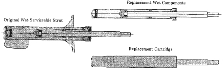 Many struts are also rebuildable. On many import cars, the struts have an internal cartridge or wet elements that can be replaced by unbolting the upper strut mount, swinging the strut out from under the fender, disassembling the upper strut components, and replacing the internal components with a new cartridge.