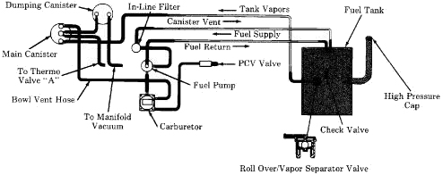 Evaporative emissions have been eliminated by sealing the fuel system and storing vapors in a charcoal canister. When the engine starts, a purge valve on the canister opens, allowing manifold vacuum to siphon vapors into the intake manifold to be burned in the engine.